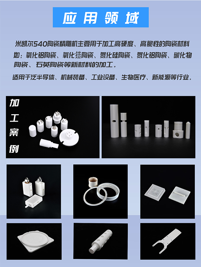 應(yīng)用范圍:主要用于加工高硬度、高脆性的陶瓷材料,如氧化鋁陶瓷、氧化鋯陶瓷、氮化硅陶瓷、氮化鋁陶瓷、碳化物陶瓷、石英陶瓷硬脆新材料的加工。適用于泛半導(dǎo)體、機械裝備、工業(yè)設(shè)備、生物醫(yī)療、新能源等行業(yè)。