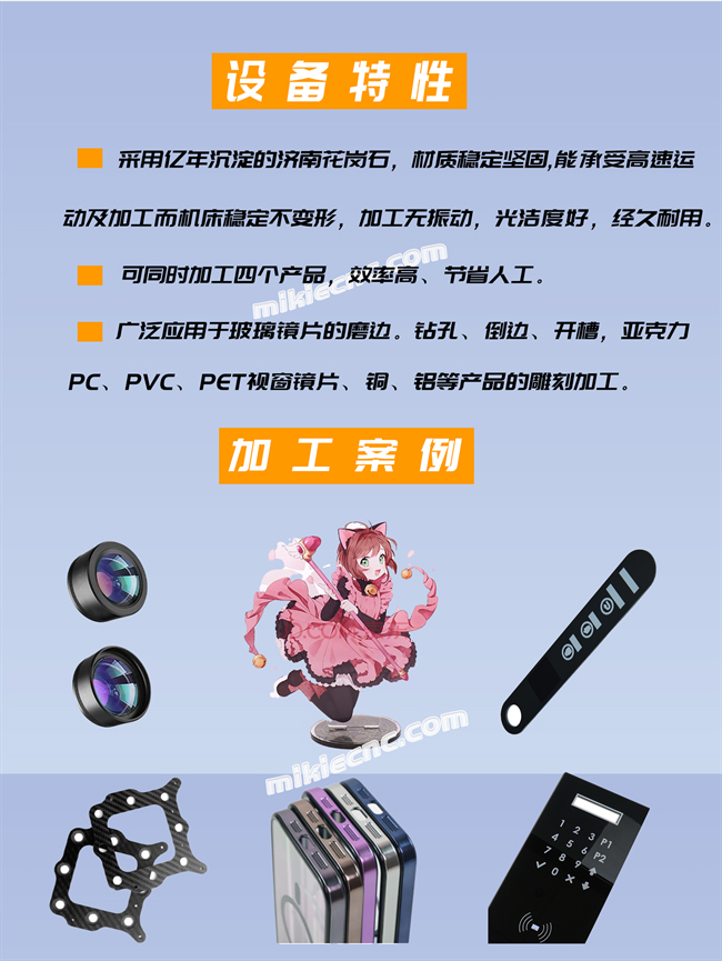應(yīng)用范圍:廣泛應(yīng)用于亞克力、石墨、玻璃、塑膠、塑料、復(fù)合材料玻纖碳纖、五金金屬、pc、pvc、pet視窗鏡片等材質(zhì)。雕銑、精密雕刻、精密切割、磨邊、倒角、倒邊、鉆孔、開槽、銑牙等精密加工。